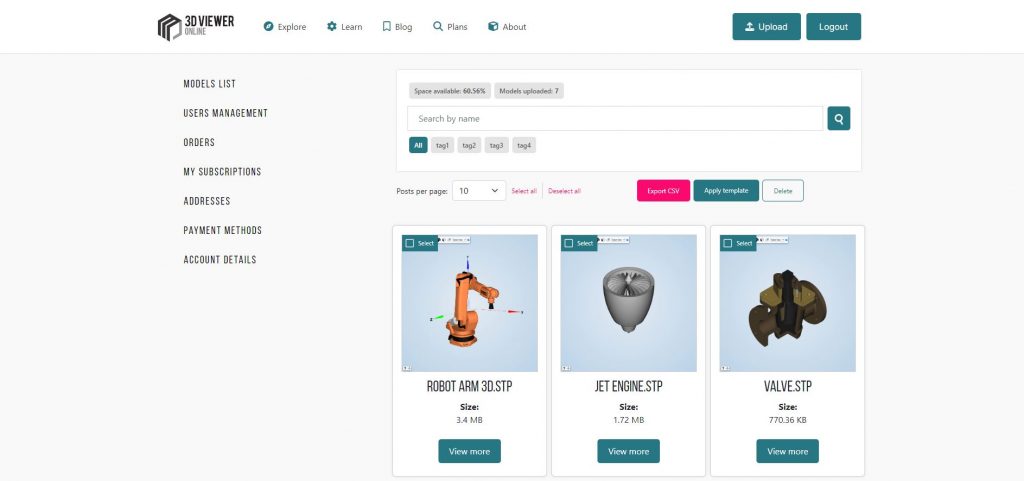 A Free account has a limit of 10 uploaded models, while a Premium or Business account has a limit only in terms of space occupied, 25 GB and 1 TB respectively. There is no limitation on the number of uploaded models in a Premium or Business account.