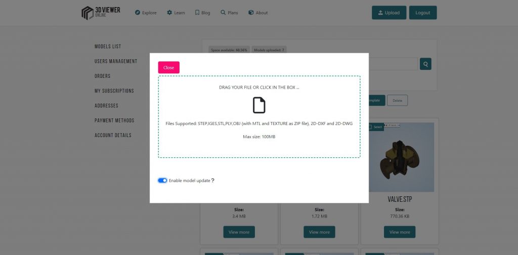 Turn on “Enable model update” to update models previously uploaded without changing their URL. This is particularly useful if you published the model already in your website or app and you don’t want to replace their URL. To update a model you need to upload a modified version of the same model, making sure you are using the same filename.
